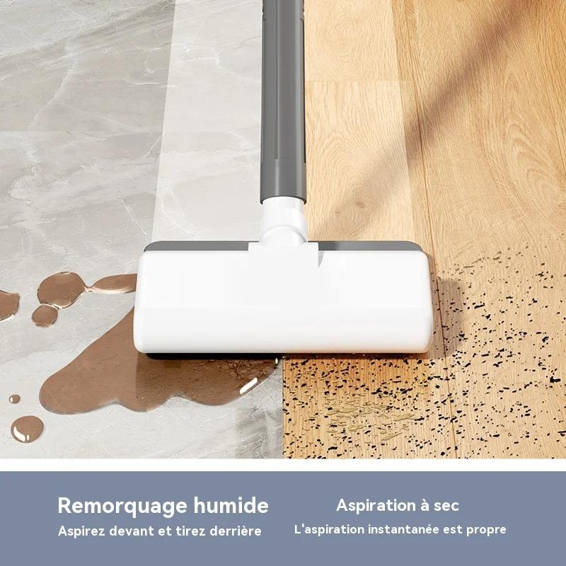 Aspiration avant + balayage arrière : capture les saletés puis essuie le sol en un seul passage.