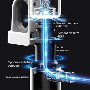 Filtre HEPA + filtre microporeux + cyclone conique : capture jusqu’à 99,97 % des particules fines et allergènes.