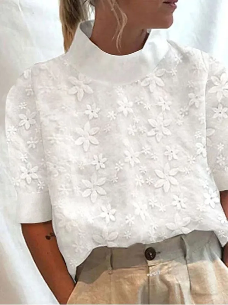 Blouse Femme Été Coton Lin – Col Creux et Dentelle