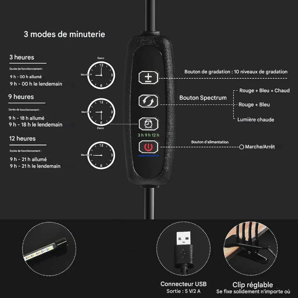 Lampe Phytosanitaire USB à 3 Couleurs – Contrôle Intelligent et Intensité Réglable